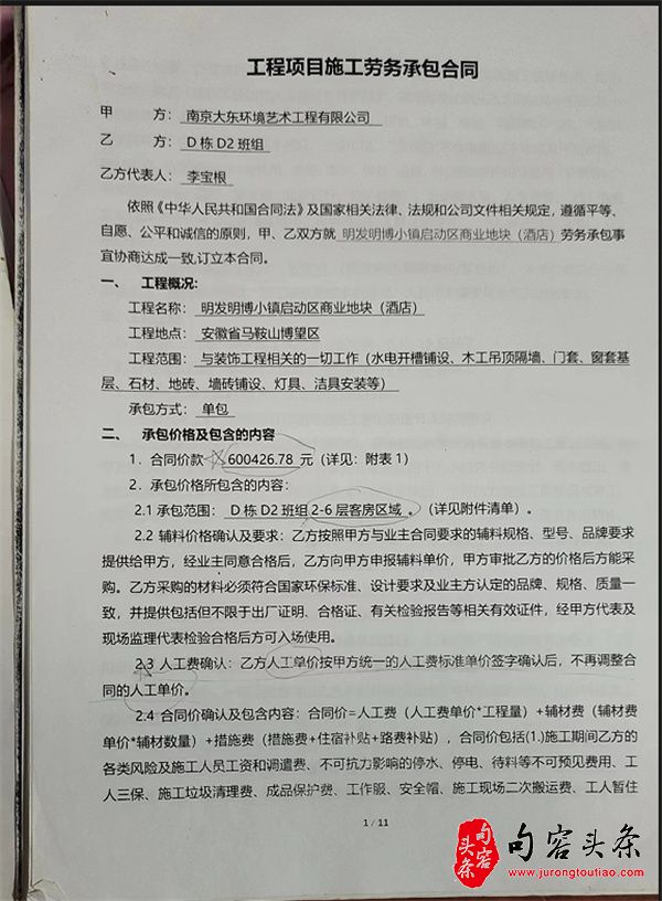 2020年8月10日,安徽省马鞍山博望区明发明博小镇启动区商业地块(即马鞍山明发国际大酒店)项目开始启动。总承包方南京大东环境艺术工程有限公司(简称南京大东)(甲方)与D栋D2班组(乙方代表人为李宝根,工程实际施工负责人为曹孝杰)签订《工程项目施工劳务承包合同》。施工地点位于安徽省马鞍山博望区。