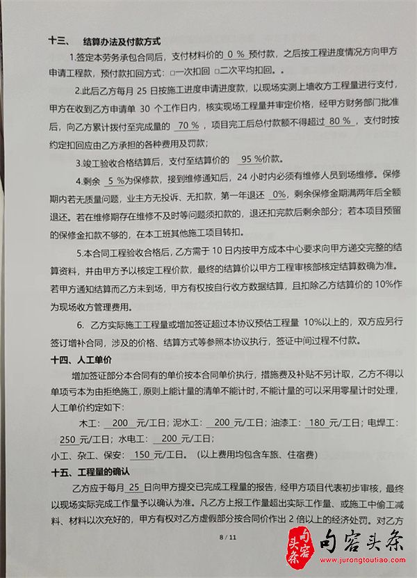 根据该承包合同,工程项目定于2020年8月15日动工,12月20日竣工,工期125天,原先工程估价60多万元。双方确定了施工价格和进度、质量标准、责任义务等施工的细节,特别明确了结算办法及付款方式:双方约定,签订劳务承包合同后,在零预付款的前提下,此后乙方每月25日按施工进度申请施工款,以现场实测上墙收方工程量进行支付,甲方在收到乙方申请单 30个工作日内,核实现场工程量并审定价格,经甲方财务部门批准后,向乙方累计拨付至完成量的70%,项目完工后总付款额不得超过80%。竣工验收合格结算后,支付至结算价的95%价款。剩余 5 %为保修款,接到维修通知后,24 小时内必须有维修人员到场维修。保修期两年内若无质量问题,业主方无投诉、无扣款,第一年退还0%,剩余保修金期满两年后全额退还。乙方实际施工工程量或增加签证超过本协议预估工程量 10%以上的,双方应另行签订增补合同,涉及的价格、结算方式等参照本协议执行,签证中间过程不付款。