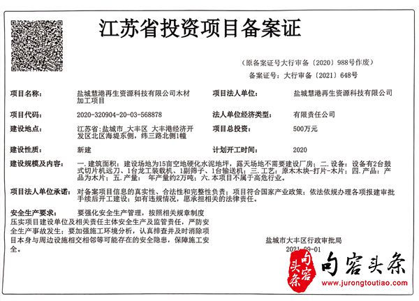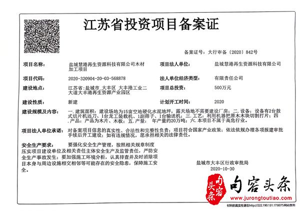 2.公司随后通过申请,在2020年10月30日取得盐城市大丰区行政审批局的投资项目备案证(备案证号:大行审备【2020】842号),项目名称为盐城慧港再生资源科技有限公司木材加工项目。