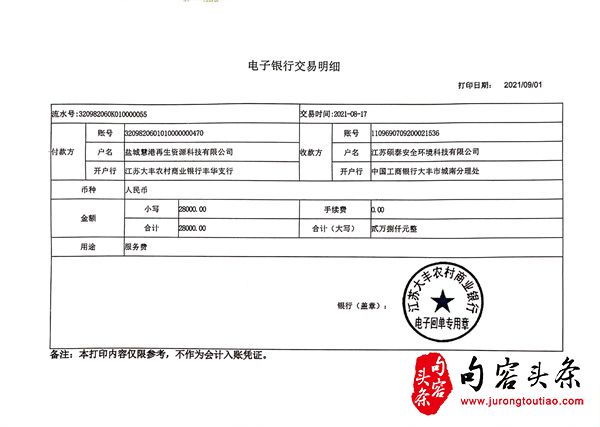 6.2021年8月,应安全生产部门的要求,公司委托江苏硕泰安全环境科技有限公司,代为办理“安全三同时”安全生产相关手续,并于2021年8月17日打款预付款28000元。2021年8月18日开始安装除尘罩等相关设施。同月,大丰港北区管理办公室强制要求臣生公司,给我司断电停产,还坚称不给慧港公司断电,臣生公司也要全部断电停产。9月中旬,不知什么原因,安全三同时手续办不下去,江苏硕泰相关负责人将预付的28000元现金退还给我公司。迫于公司生产的压力,我公司又找到江苏健安安全科技有限公司盐城分公司,并于2021年9月24日打款预付款2万元整,委托其继续办理安全生产的相关手续。