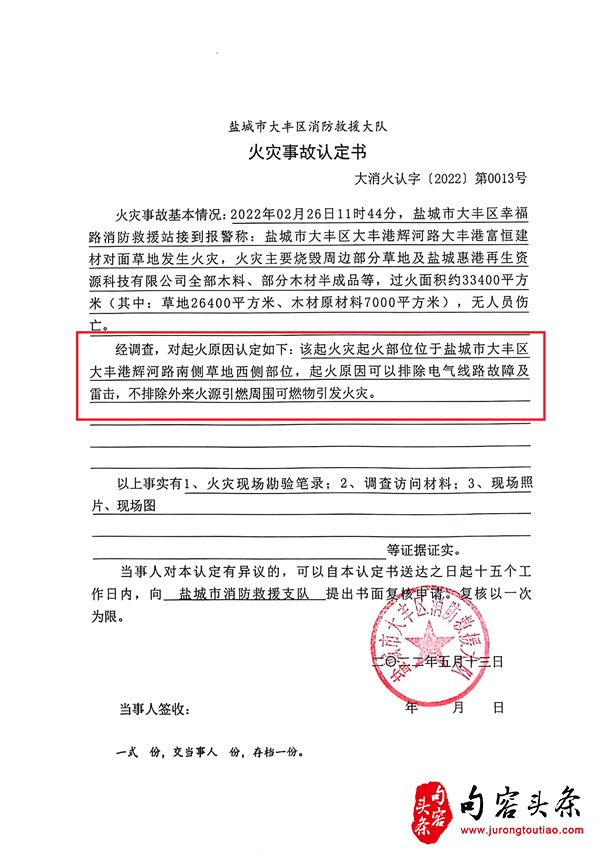 2022年3月16日,也就是火灾发生后半个多月,大丰港区有关安监负责人找到盐城慧港再生资源科技有限公司工作人员谈话。谈话内容就是说,你这类企业不符合入港区条件。其实,这次谈话明显是在补充前面没有做的工作,是在补充材料,因为前面从来没有过这样的谈话和笔录。当时,当事人还被要求签名确认。