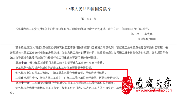 《保障农民工工资支付条例》明确规定,农民工工资责任主体是投资方和建设总包方。第三十条:分包单位对所招用农民工的实名制管理和工资支付负直接责任。施工总承包单位对分包单位劳动用工和工资发放等情况进行监督。分包单位拖欠农民工工资的,由施工总承包单位先行清偿,再依法进行追偿。