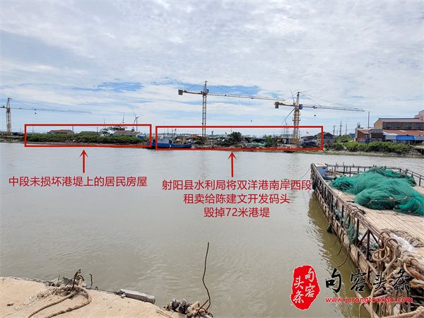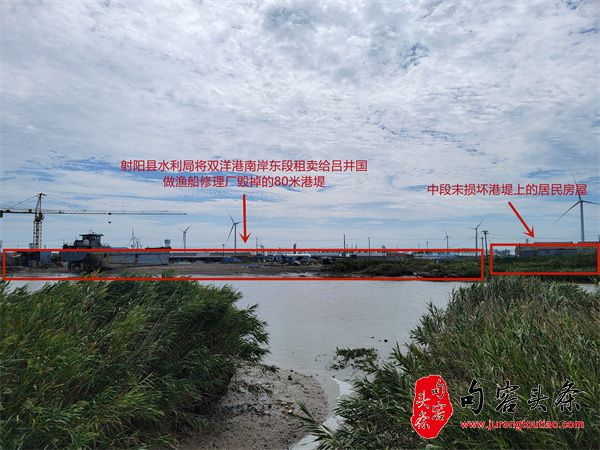 2012 年,射阳县水利局将港堤西段 72 米租给临海镇居民陈建文 20 年,租金 11 万元,承租人将港堤降近 2 米至地平面以下开发成码头。企业提出质疑遭时任县水利局五岸灌区进排水管理中心主任丁中兵无视。2014 年,丁中兵又将企业对面 92 米港堤租给吕井国开发渔船修造厂,租期 20 年,租金 17 万元,港堤被降近 2 米推平。