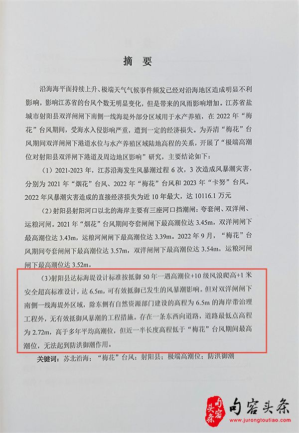 陈立飞又指出,射阳县水利局因不顾防汛抗台大局,纯粹考虑经济效益,贪图蝇头小利,擅自出租港堤给他人经营,擅自破坏防护堤,导致企业深受2021年7月26日“烟花”台风和2022年9月15日“梅花”台风影响,发生不该发生的灾情。