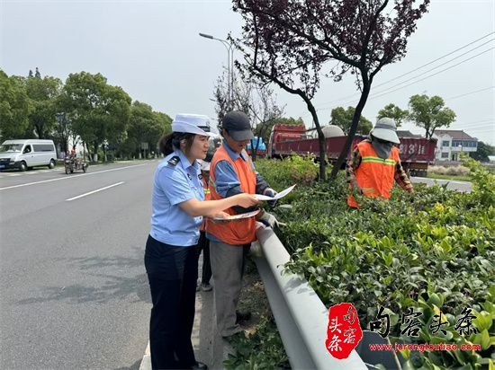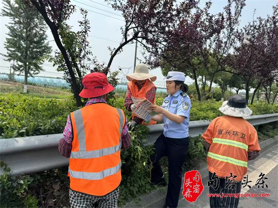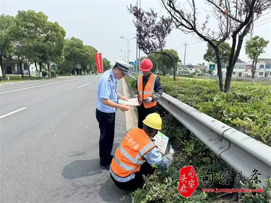 在绿化施工现场,民警与江苏中美环境工程有限公司施工人员对面对面宣传交通安全知识,讲解遵守交通规则的重要性,确保遵守交通规则前题下的安全施工。