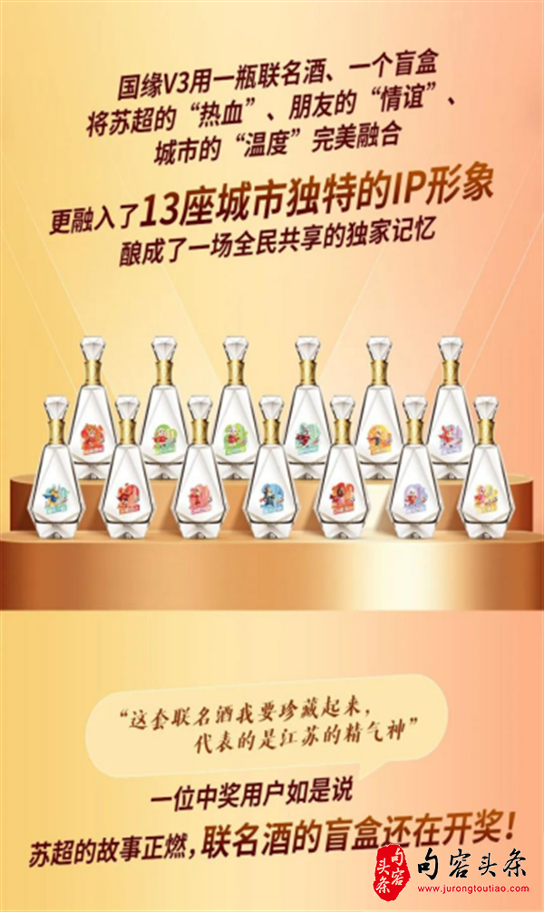 “国缘V3·苏超”联名酒一经推出,便火爆全网。“收藏记忆”成为广大球迷的追捧。“苏超”燃情出圈,引发的千万球迷狂欢、15亿粉丝围观,经历过的人,总想收藏一点珍贵的记忆。“国缘V3·苏超”联名酒 ,将苏超的“精神”、狂欢的“激情”、城市的“记忆”融入瓶中,以醉美的文化符号,留住永恒的瞬间。