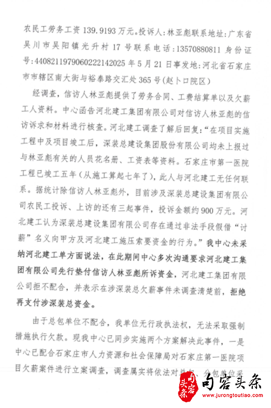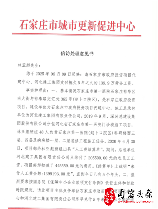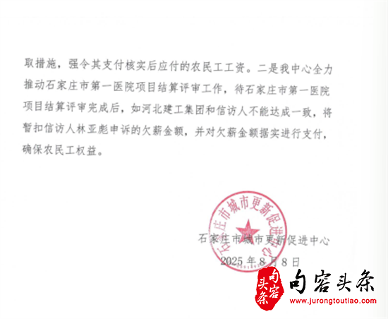 经过无数次的上访和投诉,石家庄市城市更新促进中心在调查了解到拖欠农民工工资的事实,并于2025年8月8日的信访答复中,竟以没有执法权为由,提出所谓在与当地人社局立案调查后,再责令总包和分包方支付工资,或以扣除总包单位涉及拖欠的工资数额的方式支付。但回复也前后自相矛盾,也没有明确最终解决农民工工资拖欠的期限和时间节点。回复说,还在继续推进此项目结算评定工作,也就是说,投资方至今没有和总包进行工程总决算,决算报告还没有出来,清晰表明了资金没有到位的事实。