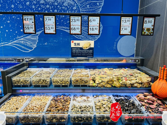 服务体验的升级贯穿于各个环节:肉禽柜台提供切丝、切片、绞肉等免费加工;海鲜区支持专业的清洗、宰杀、打氧等处理。更有多处细节体现人文关怀:食百货架旁配备放大镜,方便年长顾客查看;连卷袋处设置湿手器,便于取用;散装食品区标注“一斤约多少个”,让购买更直观;试鞋区提供一次性袜套,确保卫生;收银台备有免费应急耗材,解顾客不时之需。食品安全管控严格,鲜切水果执行“468”时间管理原则,超过4小时打八折,超过6小时打六折,超过8小时下架,部分叶菜、肉禽、水产实行“日清打折”,全力守护消费者“舌尖上的安全”。