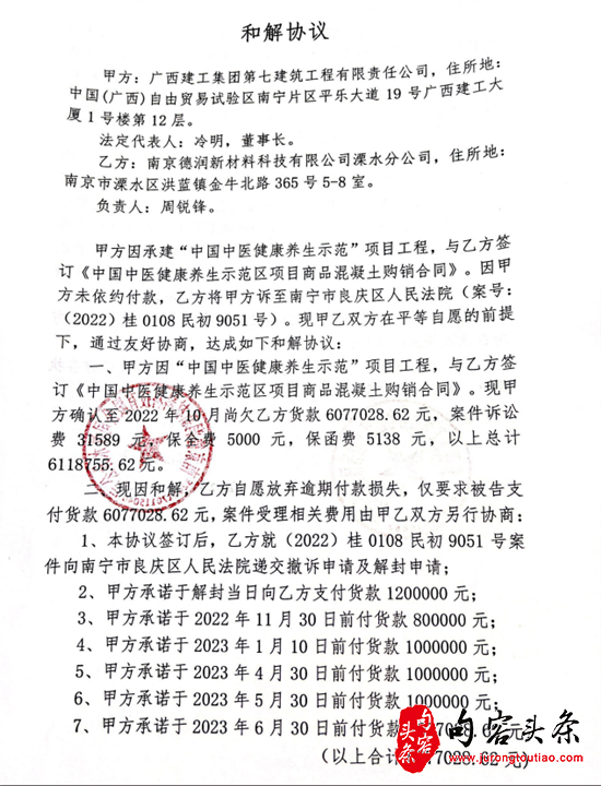 材料商供应的混凝土是农民工养家糊口的血汗钱。按国家政策也应该在工程结束2个月内支付,并且支付利息和违约金。眼下又到2025年下半年,广西建工集团第七建筑工程有限责任公司拖欠的300多万材料款仍然未有着落。
