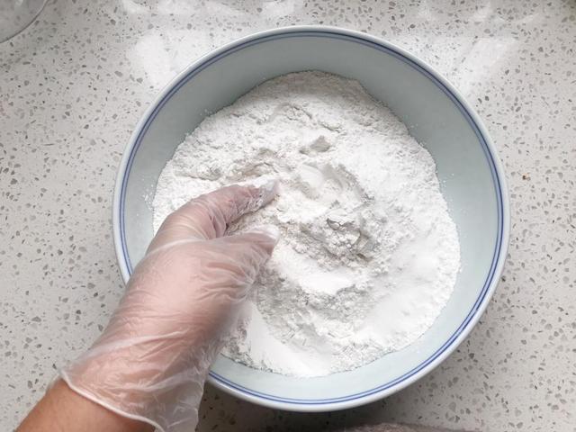 4. 混合搅拌好后的面粉有硬结,这时我们需要继续进行揉搓,然后带上手套把面团捏碎,让面团全部成粉末。