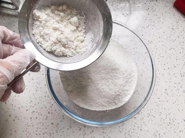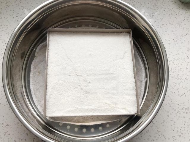 5. 然后准备一个细筛子,把面粉需要进行过筛,这一步非常重要我们需要慢慢来不要过于心急,只有粉末细腻这样蒸出来的桂花糕才会软糯蓬松。