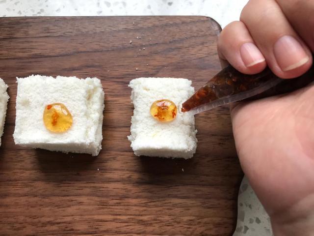 8. 不烫手后我们只需要把桂花糕切成大小一致的小块,然后放到盘中进行备用,在准备一个裱花袋在袋子中加入新鲜的桂花与蜂蜜或者白砂糖均匀的搅拌均匀,然后适量的挤入到桂花糕上进行装饰提味即可。