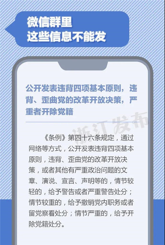 在微信群里发表重大原则问题不同中央保持一致的言论或发表违背四项基本原则,违背、歪曲党的改革开放决策的言论,严重者将被开除党籍。微信群非法外之地,公职人员在群内聊天时,有哪些信息不能发?一定要注意了!(来源:浙江发布)