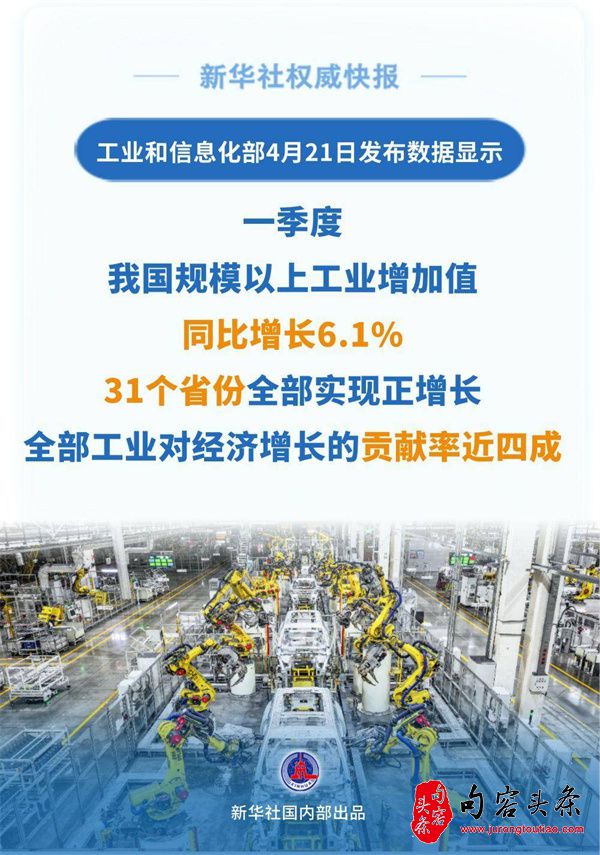 4月21日发布数据显示,一季度,我国规模以上工业增加值同比增长6.1%,31个省份全部实现正增长,行业增长面超八成,全部工业对经济增长的贡献率近四成。