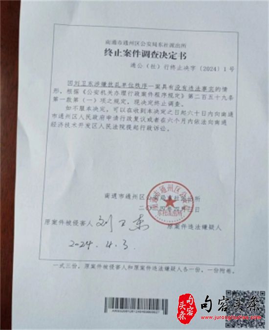 事实上,在当地跟刘卫东有相同遭遇的不只是他一家,其他人有的被打压不敢说话,有的上访无果放弃了权力的争取。刘卫东却始终不肯放弃对自己权力的维护,他始终相信,在依法治国的大环境下,法律是维护公平正义的。就在几前天,刘卫东接到通州区公安局东社派出所的《终止案件调查决定书》,载明“刘卫东涉嫌扰乱单位秩序一案具有没有违反事实的情形”,而可笑的是在该决定书上原案件被侵害人处签的是刘卫东的名字,该决定书的开头刘卫东还是“涉嫌扰乱单位秩序”,结尾时却成了“案件被害人”,这是当地公安部门给刘卫东在首都召开大型会议之前担心他去上访,给他套上了“涉嫌扰乱单位秩序”的莫须有的罪名,在首都大型会议之后,又不得不给他把这个莫须有的“涉嫌扰乱单位秩序”的夹板摘下来,可见当地对于刘卫东是多么的“关照、关注”,对于刘卫东上访是多么的恐惧。
