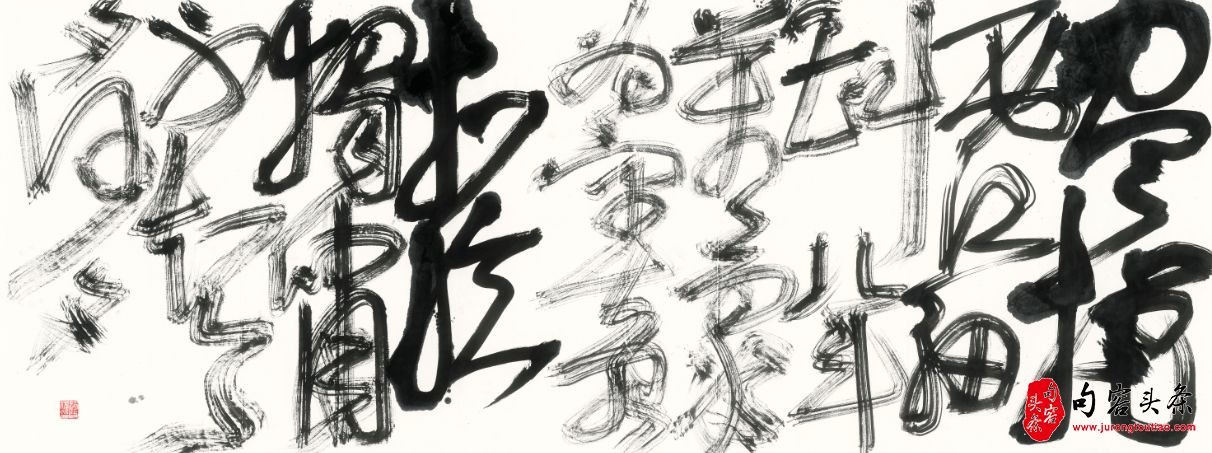 启斌的书法我认为是从颜真卿、柳公权入手而展开的,然后逐步引入先秦书法元素、汉魏碑版、六朝人的书法审美、明清大草而确立出自己的风格,浑穆、纵逸而精妙。一问其来处,果然如我所料。他的祖父就是终生学颜真卿,他的姑父学柳公权、赵孟頫,早在启蒙阶段他显然早已经超越了一般学书者的境界,大家都还在汲汲于碑帖之争、执着于学名家象与不象时,他早已走进了历史深处去深入挖掘,其见识显然自是不凡。《古尊俗语录》有话说,“见过于师,方堪传授,见不如师,灭师半德”,从启斌的早年遭际看,信然。他的书法经过五十年的浸润,已自成机杼,其审美意象宛如大将横刀立马冲锋斗雪、高山巨峰巍峨直冲天际……完全不像出自一位白面书生之手,非常奇怪,也很让人想到《史记》中所记载时人对留侯张良的评判,总以为他是一位高大威猛、叱咤风云的男子汉形象,而真实面目宛然妇人,真为造物者惊愕。当然,更不可思议的是,启斌竟然用八寸長锋羊毫挥写之,特制大笔挥写之,有的出锋甚至达四十八厘米之巨,他所写巨幅书法用笔吸足墨、水不下十数斤、数十斤,非常人所及,非常人之功。我认为他的巨幅书法真堪独开一面,是从传统中来创立出来的书法审美境象,全然不同于当下的现代书法艺术、现代艺术。