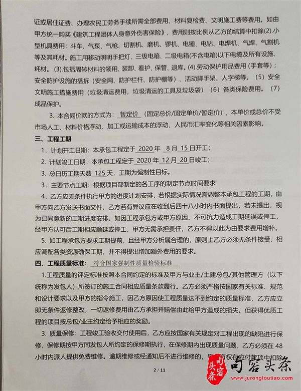 根据该承包合同,工程项目定于2020年8月15日动工,12月20日竣工,工期125天,原先工程估价60多万元。双方确定了施工价格和进度、质量标准、责任义务等施工的细节,特别明确了结算办法及付款方式:双方约定,签订劳务承包合同后,在零预付款的前提下,此后乙方每月25日按施工进度申请施工款,以现场实测上墙收方工程量进行支付,甲方在收到乙方申请单 30个工作日内,核实现场工程量并审定价格,经甲方财务部门批准后,向乙方累计拨付至完成量的70%,项目完工后总付款额不得超过80%。竣工验收合格结算后,支付至结算价的95%价款。剩余 5 %为保修款,接到维修通知后,24 小时内必须有维修人员到场维修。保修期两年内若无质量问题,业主方无投诉、无扣款,第一年退还0%,剩余保修金期满两年后全额退还。乙方实际施工工程量或增加签证超过本协议预估工程量 10%以上的,双方应另行签订增补合同,涉及的价格、结算方式等参照本协议执行,签证中间过程不付款。