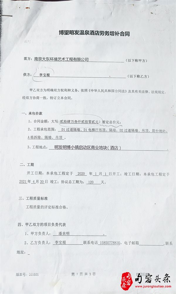 后因甲方需求,附加额外工程量,甲乙双方了签订《博望明发温泉酒店劳务增补合同》,双方约定增量工程于2021年1月1日动工,4月30日竣工,工期120天,暂定总价为24万多元。