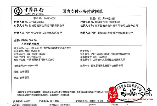 6.2021年8月,应安全生产部门的要求,公司委托江苏硕泰安全环境科技有限公司,代为办理“安全三同时”安全生产相关手续,并于2021年8月17日打款预付款28000元。2021年8月18日开始安装除尘罩等相关设施。同月,大丰港北区管理办公室强制要求臣生公司,给我司断电停产,还坚称不给慧港公司断电,臣生公司也要全部断电停产。9月中旬,不知什么原因,安全三同时手续办不下去,江苏硕泰相关负责人将预付的28000元现金退还给我公司。迫于公司生产的压力,我公司又找到江苏健安安全科技有限公司盐城分公司,并于2021年9月24日打款预付款2万元整,委托其继续办理安全生产的相关手续。