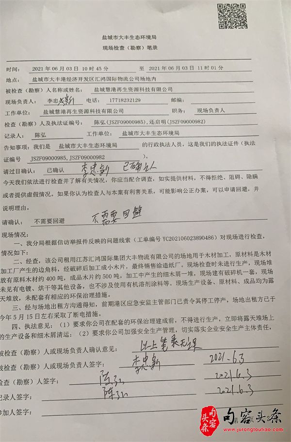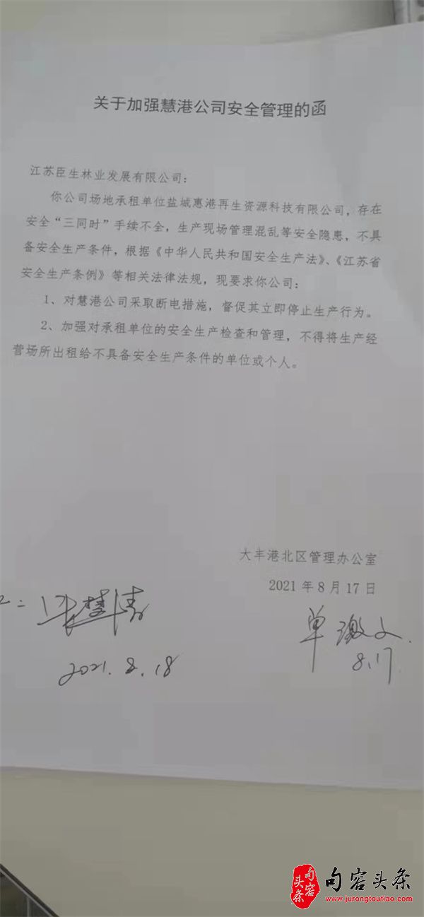 2022年3月16日,也就是火灾发生后半个多月,大丰港区有关安监负责人找到盐城慧港再生资源科技有限公司工作人员谈话。谈话内容就是说,你这类企业不符合入港区条件。其实,这次谈话明显是在补充前面没有做的工作,是在补充材料,因为前面从来没有过这样的谈话和笔录。当时,当事人还被要求签名确认。