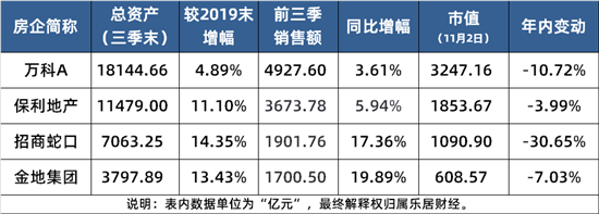 市值规模:以11月2日收盘价计算,四家房企市值分别为:万科3247.16 亿元、保利1853.67亿元、招商1090.90亿元、 金地608.57亿元。