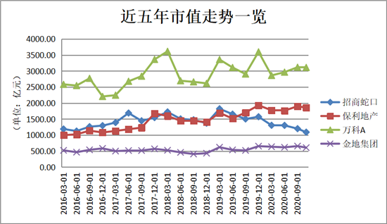 截取近五年市值走势,万科、保利呈震荡上升态势,金地较为平稳。
