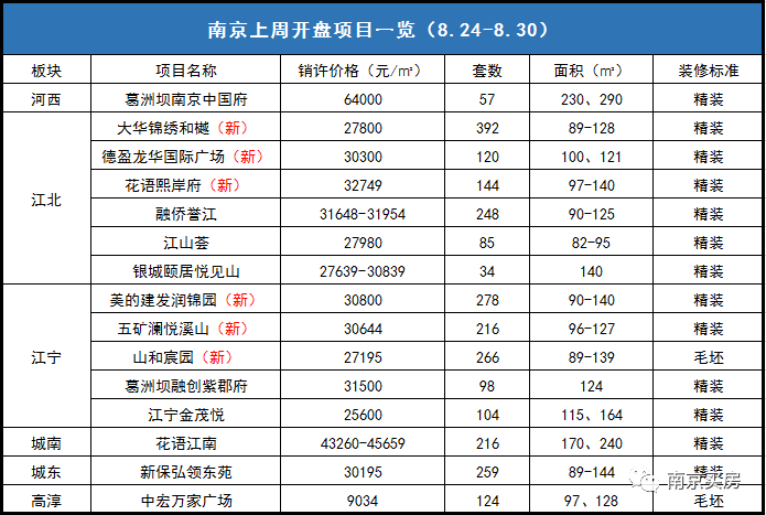 上周(8.24-8.30),南京共15个楼盘开盘,其中江北和江宁供货量最大,有6盘为首开。在去化方面,河西顶豪中国府、江核花语熙岸府、城南改善花语江南均当天售罄;美的建发润锦园和葛洲坝融创紫郡府去化九成左右。