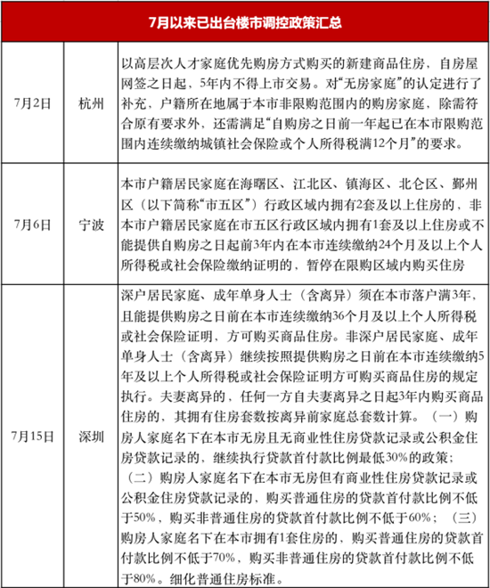 随后,浙江台州、丽水、海盐等多个三四线城市发布楼市调控政策,掀起了新一轮三四线城市调控新周期。自7月热点二线城市纷纷加码调控至今,地方因城施策,调控正逐渐深入至三四线城市,未来调控大概率将继续维稳,以更好地落实稳地价、稳房价、稳预期的长期目标。