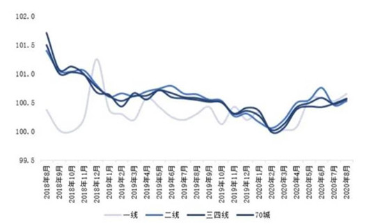 图:2018年8月以来70城及各能级城市新建商品住宅价格指数环比走势