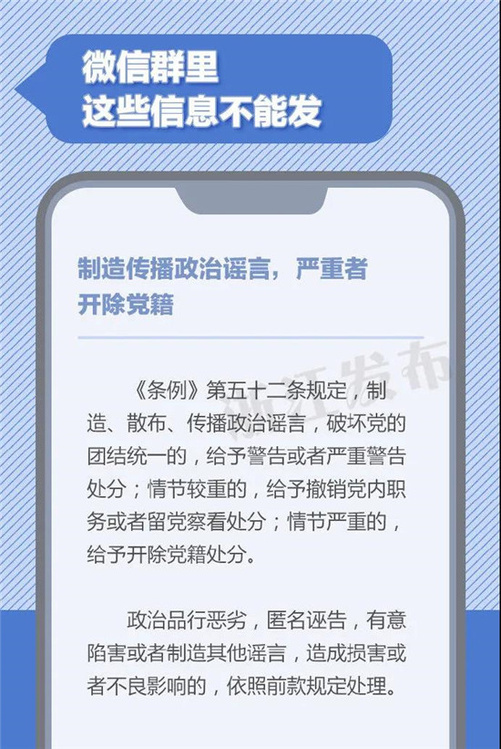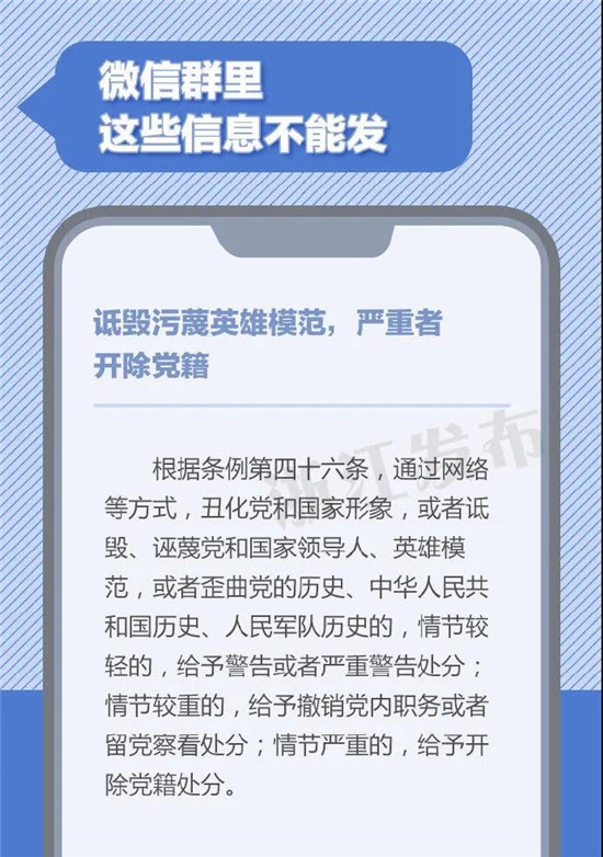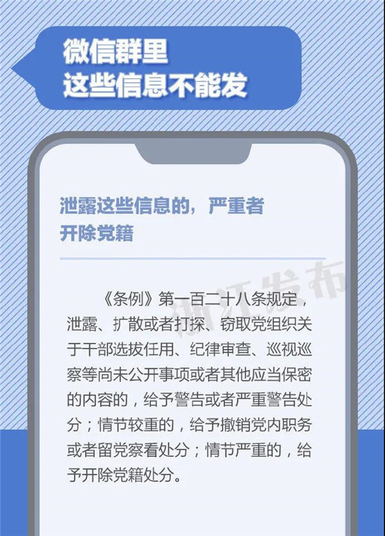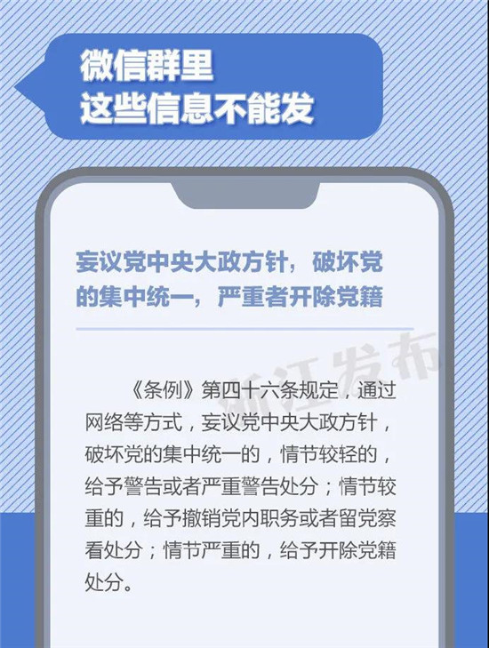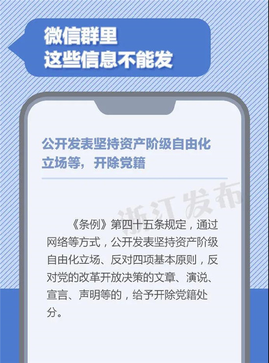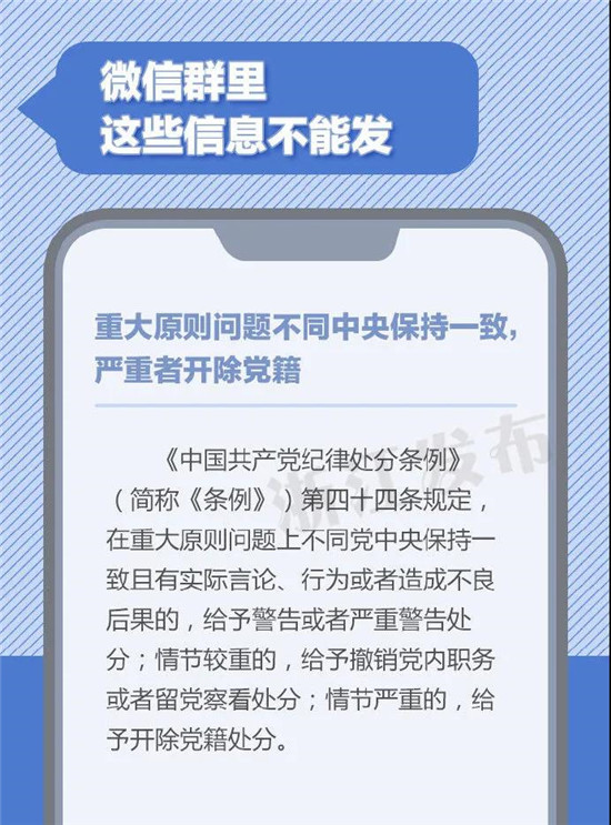 在微信群里发表重大原则问题不同中央保持一致的言论或发表违背四项基本原则,违背、歪曲党的改革开放决策的言论,严重者将被开除党籍。微信群非法外之地,公职人员在群内聊天时,有哪些信息不能发?一定要注意了!(来源:浙江发布)