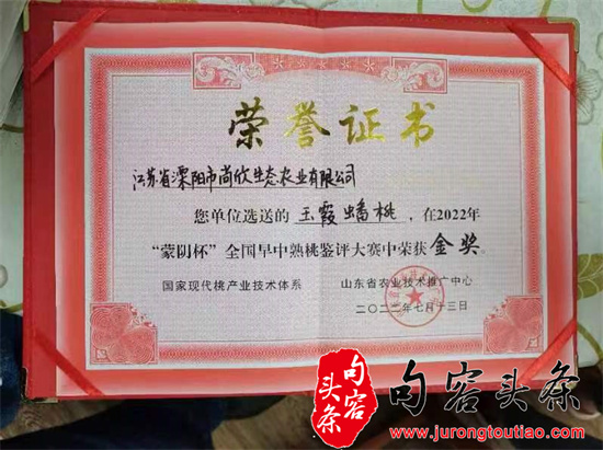 句容头条讯 日前,由江苏省溧阳市尚欣生态农业有限公司选送的“玉霞蟠桃”在2022年“蒙阴杯”全国早中熟桃鉴评大赛中荣获金奖。
