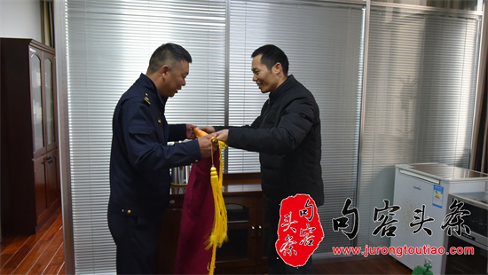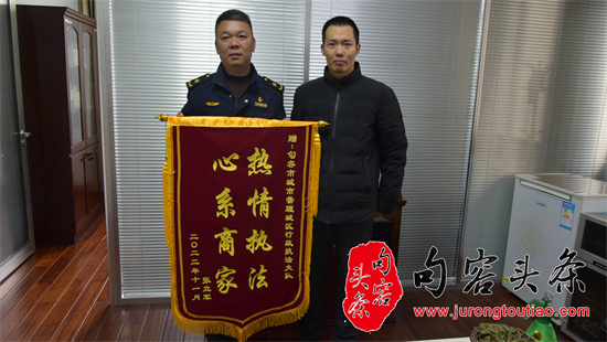 句容头条讯 11月30日下午,江苏鑫盛物业管理有限公司负责人与商户张先生手持两面印有“怀爱民之心 办利民之事”“热心执法 心系商家”的锦旗,来到句容市城管局城区执法大队,感谢市容一中队中队长王成帮助调解矛盾纠纷,实现经营与管理双赢。“感谢咱们王队长的帮助,解决了我的烦心事。”张先生真挚地说。
