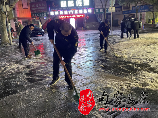 19时40分,句容中大街,60多名城管志愿者早已集合完毕,改变下班行程,主动加入“铲冰除雪”行动,一抹抹“志愿红”如盏盏“红灯笼”营造了原本彩灯万盏的元宵“氛围感”。在分包路段上,城管志愿者们不畏严寒,拿起铁锹、扫帚,卯足干劲,齐心协力清除积雪。