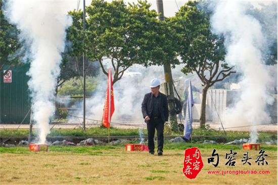 (大楼封顶仪式上锣鼓喧天 鞭炮齐鸣)