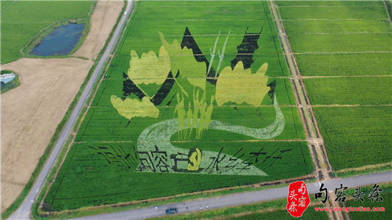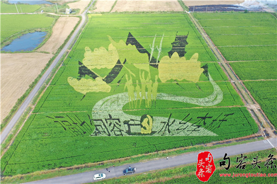 句容头条讯 九月,稻花飘香。在句容市李家桥村“梦里水乡”千亩水稻基地,连片水稻生机勃勃、长势喜人。五彩景观3D “稻田画”,长度120米,宽度101米。远处瞭望,忽隐忽现;在无人机空中鸟瞰下,格外醒目。整体“稻田画”颜色以绿色、白色、黑色等不同品种水稻颜色为主色调,主题鲜明。一,画面突出以道教茅山,山水句容为背景,内容中融入以宣扬时代抗战英雄新四军为载体的主题渲染。二,党建部分体现践行弘扬红船精神为契机,喜迎建党百年为元素。坚定主旨信念感党恩,听党话,跟党走的工作作风。三,文字部分“福地句容,水乡李桥”八个大字清晰可见。依托道教茅山,山水句容与喜迎建党百年为契机,为此表达“奔向十四五,李桥再出发”的奋斗目标。映射出乡村振兴的多彩、活力和创新。