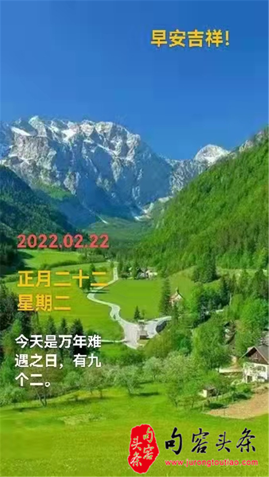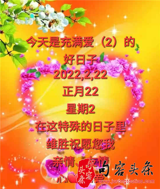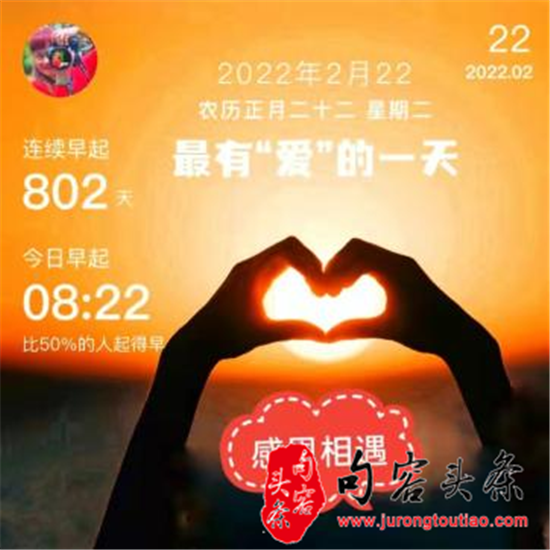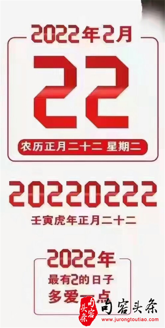 句容头条讯 昨天是2022年2月22日星期二,农历正月二十二,9个“2”阿拉伯数字结合在一起,号称史无前例。“2”与“爱”谐音,因此,昨天一大早打开微信号和朋友圏,手机的屏幕上便被各种“爱”、“爱”“爱”占满。