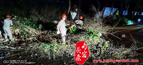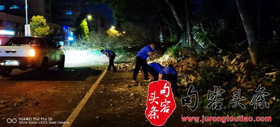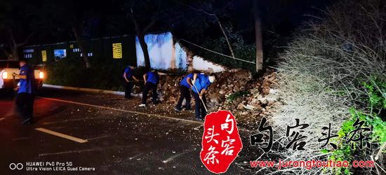 句容头条讯(李雪庭) 7月30日晚,句容市城管局渣土管理科执法队员在宁杭北路农科所路段巡查时,发现一处倒伏树木和坍塌的围墙,倒伏的树木和坍塌的围墙阻碍了车辆通行,为确保城市道路交通安全、畅通,执法队员紧急联合园林工人采取措施,防止了安全事故的发生。