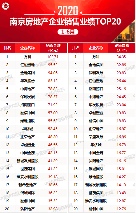 2020年1-6月份,南京房地产销售业绩TOP20企业合计销售697.55亿元,销售面积TOP20企业合计销售253.04万方。销售额突破50亿房企达到10家。其中,万科凭借项目数量和销售优势,以102.71亿元、34.35万方位居销售金额榜、销售面积榜双榜冠军;仁恒置地以95.52亿元位居销售金额榜单第二名,金地集团以94.06亿元位居销售金额榜单第三名;销售面积榜中,金地集团以32.86万方位居第二名,保利发展以29.83万方位列第三名。