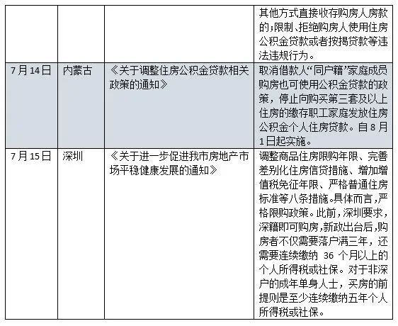 7月以来,包括杭州、东莞、宁波、内蒙古、郑州、深圳等房价有所上涨的城市开始出台房地产调控收紧政策。其中,一线城市深圳出台八项调控措施抑制楼市过热,被认为具有风向标意义。深圳调控政策对限购政策、离异购房、普通住房标准等精准细化并及时“打补丁”。