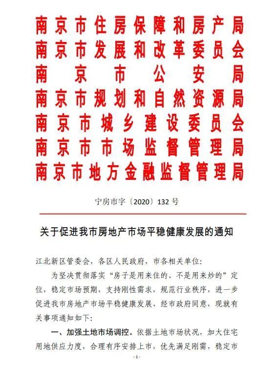 今日凌晨,南京市住房保障和房产局等7部门联合出台楼市新政,进一步加强土地市场调控,完善住房限购政策,支持刚性购房需求,以贯彻落实“房子是用来住的、不是用来炒的”定位,促进该市房地产市场平稳健康发展。