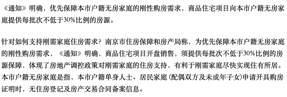 新政提出,将依据土地市场状况,加大住宅用地供应力度,合理有序安排上市,优先满足刚需。严格执行“限房价、竞地价”出让模式,提高土地市场准入条件,建立热点区域住宅用地报名单位资格筛查机制。优先保障该市户籍无房家庭的刚性购房需求,商品住宅项目向该市户籍无房家庭提供每批次不低于30%比例的房源。