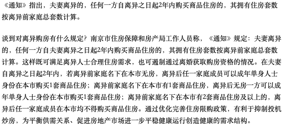 今日(7月23日)凌晨,据南京市住房保障和房产局官网消息,南京七部门联合印发《关于促进我市房地产市场平稳健康发展的通知》(以下简称《通知》),《通知》提出,支持刚性购房需求,完善住房限购政策,夫妻离异的,任何一方自离异之日起2年内购买商品住房的,其拥有住房套数按离异前家庭总套数计算。