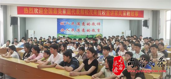 句容头条讯 在5月15日国际家庭日来临之际,5月6日下午,南通市通州区新坝初级中学邀请辖区全国最美家庭代表殷松茂、南通好人殷建峰、通州好人金红娟走进校园,开展了一场别开生面的家风宣讲活动,400多名师生共同聆听最美故事,感受优良家风。