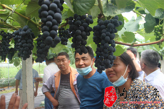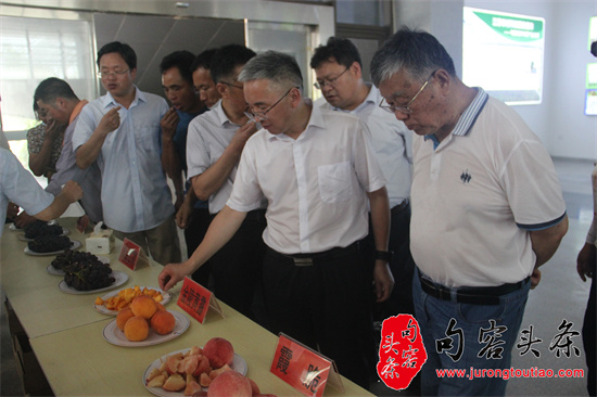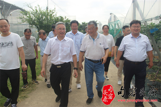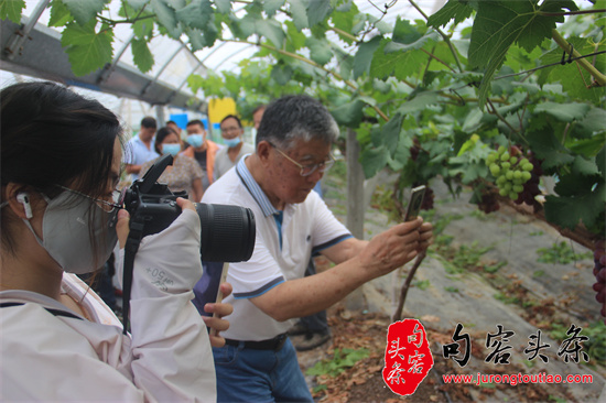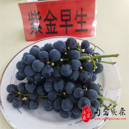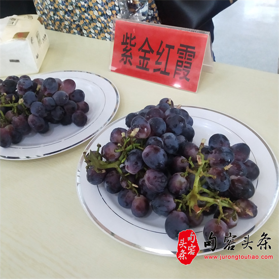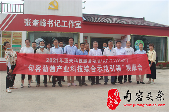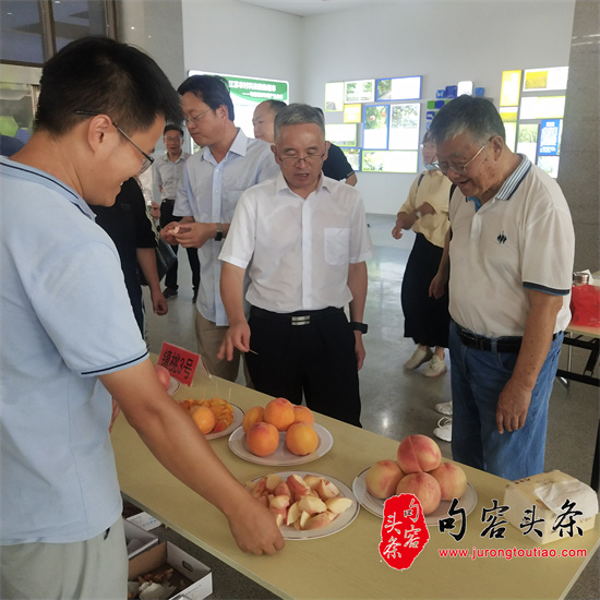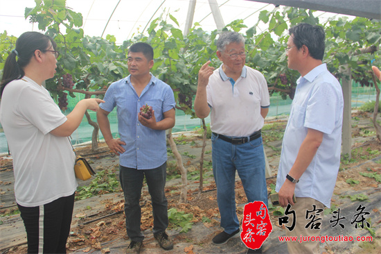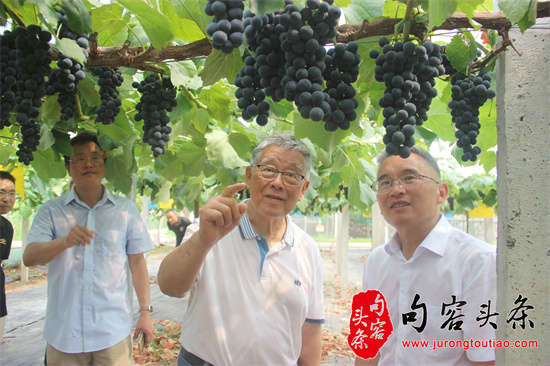 句容头条讯 7月3日上午10时许,在句容市白兔镇致富果业专业合作社社长、省劳动模范、句容市“十佳”新型职业农民张奎峰的家庭农场内,全国脱贫攻坚楷模、镇江农科所原所长、新当选的二十大党代表赵亚夫,江苏省农业科学院副院长孙洪武, 省农业科学院果树研究所俞明亮所长、王西成副所长,省农业科学院葡萄创新团队吴伟民、王壮伟研究员等省农科院、省院果树所、镇江农科所的领导、专家,以及镇江地区葡萄、桃生产经营者和种植户代表前来专门观摩亚夫科研团队专项“句容葡萄产业科技综合示范引领”的新品“紫金早生、紫金红霞”。