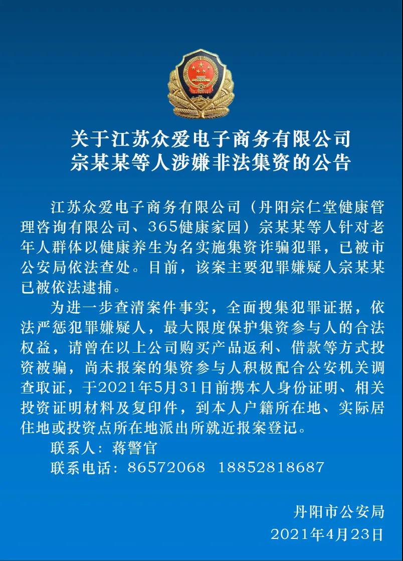 关于江苏众爱电子商务有限公司宗某某等人涉嫌非法集资的公告