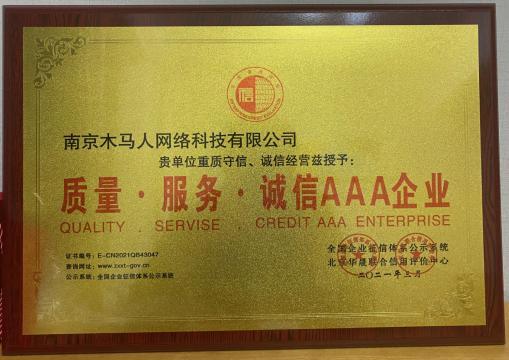喜讯!坚守诚信口碑,南京木马人网络获“质量-服务-诚信3A企业”称号!