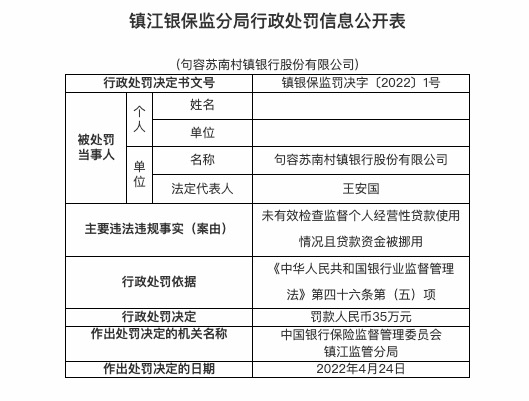 因贷款资金被挪用等,句容苏南村镇银行被罚35万